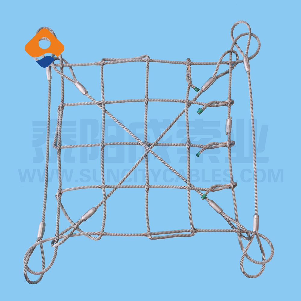 吊装索网用途:广泛用于码头,港口,建筑工地的散装货物装卸,起吊作业等。常用的钢丝绳表面状态主要有两种:①光面。②镀锌。主要结构为:6*19,6*24,6*37;绳径一般不超过12mm。