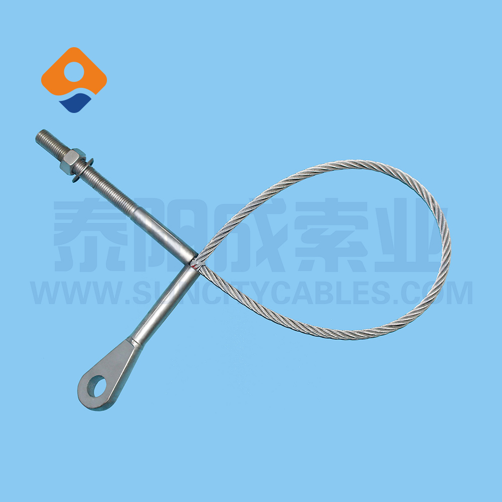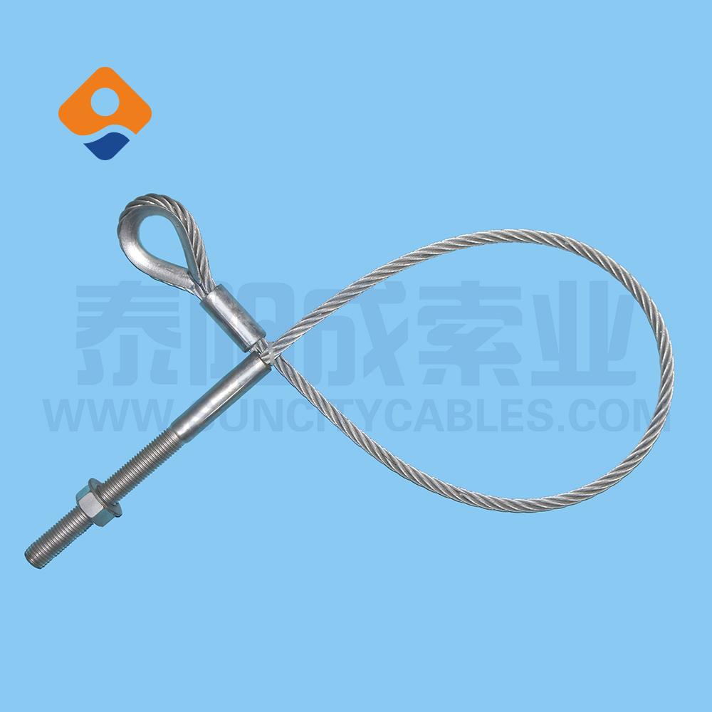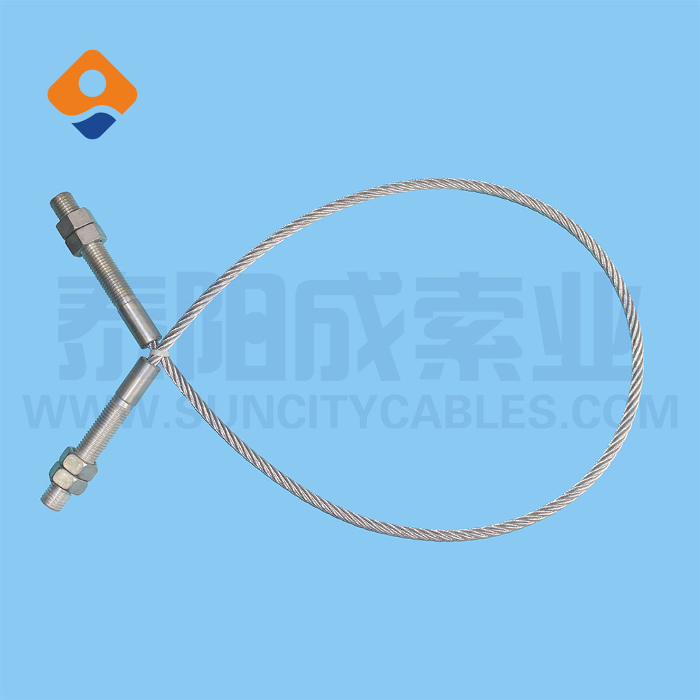 该产品采用重要用途钢丝绳与优质低碳钢加工的配件(连杆、单耳、U型叉等)压制而成的产品。产品加工前,钢丝绳先进行自制设备预张拉工艺处理,施加最大载荷不超出最小破断拉力的60%,清除钢丝绳结构伸长以及捻向的应力,使钢丝绳中股和钢丝受力均匀,减少用户在使用中的调停次数,提高钢丝绳的使用寿命,这是我司产品与国内外同行相比的独特之处。钢丝绳品种一般采用点或线接触钢丝绳,如:6*19,6*37,6*19S,6*25Fi,6*36SW等结构。